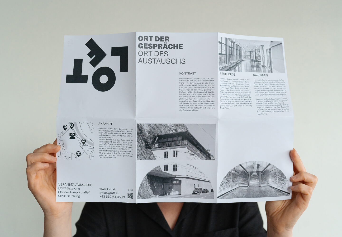 Im Herzen der historischen Salzburger Altstadt liegt das LOFT – die ultimative Eventlocation für Veranstaltungen aller Art. Doch wie wird aus einer Eventlocation ein Ort mit Persönlichkeit? Um ganzheitlich zu überzeugen, braucht es Detailverliebtheit. So wird eine Marke in allen Ecken und Enden räumlich erlebbar. Das Ergebnis ist ein visuelles Gesamtpaket, Elemente der Innen- und Außenraumgestaltung finden sich auch im Corporate Design der Marke wieder.